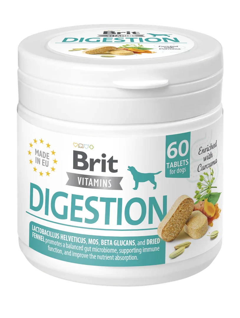 Minden Brit Vitamins Digestion tabletta tartalmazza a probiotikus Lactobacillus helveticust , amely támogatja a bélrendszer egészségét, kapor , mojave yucca kivonatot, béta-glükánokat és emésztőenzimeket, amelyek elősegítik a hasznos anyagok felszívódását. Az Ízletes tabletták olyan esszenciális tápanyagok és funkcionális gyógynövények, amelyek támogatják a kutyák egészségét a betegség időszakában, támogatják a fizikailag aktív kutyák kondícióját, és segítenek megőrizni az idősebb állatok jó közérzetét.